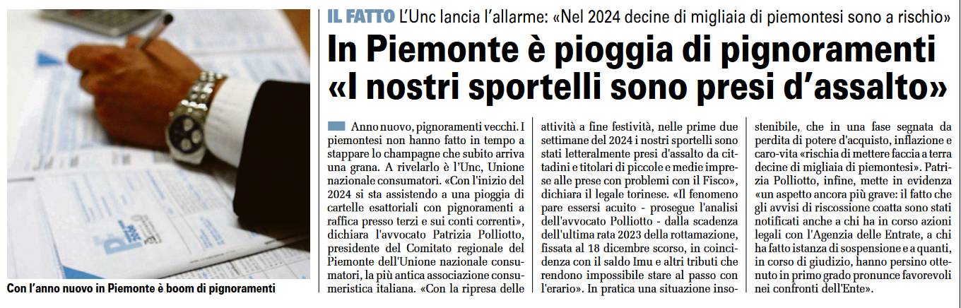 Anno nuovo, pignoramenti vecchi. I piemontesi non hanno fatto in tempo a stappare lo champagne che subito arriva una grana. A rivelarlo è l’Unc, Unione nazionale consumatori. «Con l’inizio del 2024 si sta assistendo a una pioggia di cartelle esattoriali con pignoramenti a raffica presso terzi e sui conti correnti», dichiara l’avvocato Patrizia Polliotto, presidente del Comitato regionale del Piemonte dell’Unione nazionale consumatori, la più antica associazione consumeristica italiana. «Con la ripresa delle attività a fine festività, nelle prime due settimane del 2024 i nostri sportelli sono stati letteralmente presi d’assalto da cittadini e titolari di piccole e medie imprese alle prese con problemi con il Fisco», dichiara il legale torinese. «Il fenomeno pare essersi acuito – prosegue l’analisi dell’avvocato Polliotto – dalla scadenza dell’ultima rata 2023 della rottamazione, fissata al 18 dicembre scorso, in coincidenza con il saldo Imu e altri tributi che rendono impossibile stare al passo con l’erario». In pratica una situazione insostenibile, che in una fase segnata da perdita di potere d’acquisto, inflazione e caro-vita «rischia di mettere faccia a terra decine di migliaia di piemontesi». Patrizia Polliotto, infine, mette in evidenza «un aspetto ancora più grave: il fatto che gli avvisi di riscossione coatta sono stati notificati anche a chi ha in corso azioni legali con l’Agenzia delle Entrate, a chi ha fatto istanza di sospensione e a quanti, in corso di giudizio, hanno persino ottenuto in primo grado pronunce favorevoli nei confronti dell’Ente»